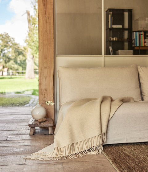 Die Wolldecke ist wunderbar als Bettüberwurf im kalten Winter, zum Wärmen bei der morgendlichen Meditation, als Tagesdecke für das Bett oder als wärmender Sofaüberwurf. Die hochwertige Wolle und das minimalistische Design machen die Decke zeitlos und passen in jedes Zuhause.