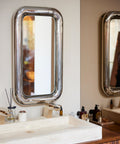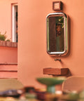 Der Spiegel mit seinem pummeligen Chromrand ist ein absoluter Eyecatcher an der Wand. Die harten Materialien wirken durch den sanft gerundeten Rand weicher.