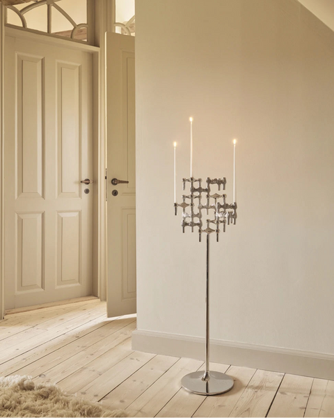 Der Bodenkerzenständer verwendet dasselbe ikonische Design wie der berühmte STOFF Nagel Kerzenhalter. Dank der modularen Bauweise lassen sich verschiedene Elemente hinzufügen, so dass du deine ganz persönliche Skulptur gestalten kannst.
